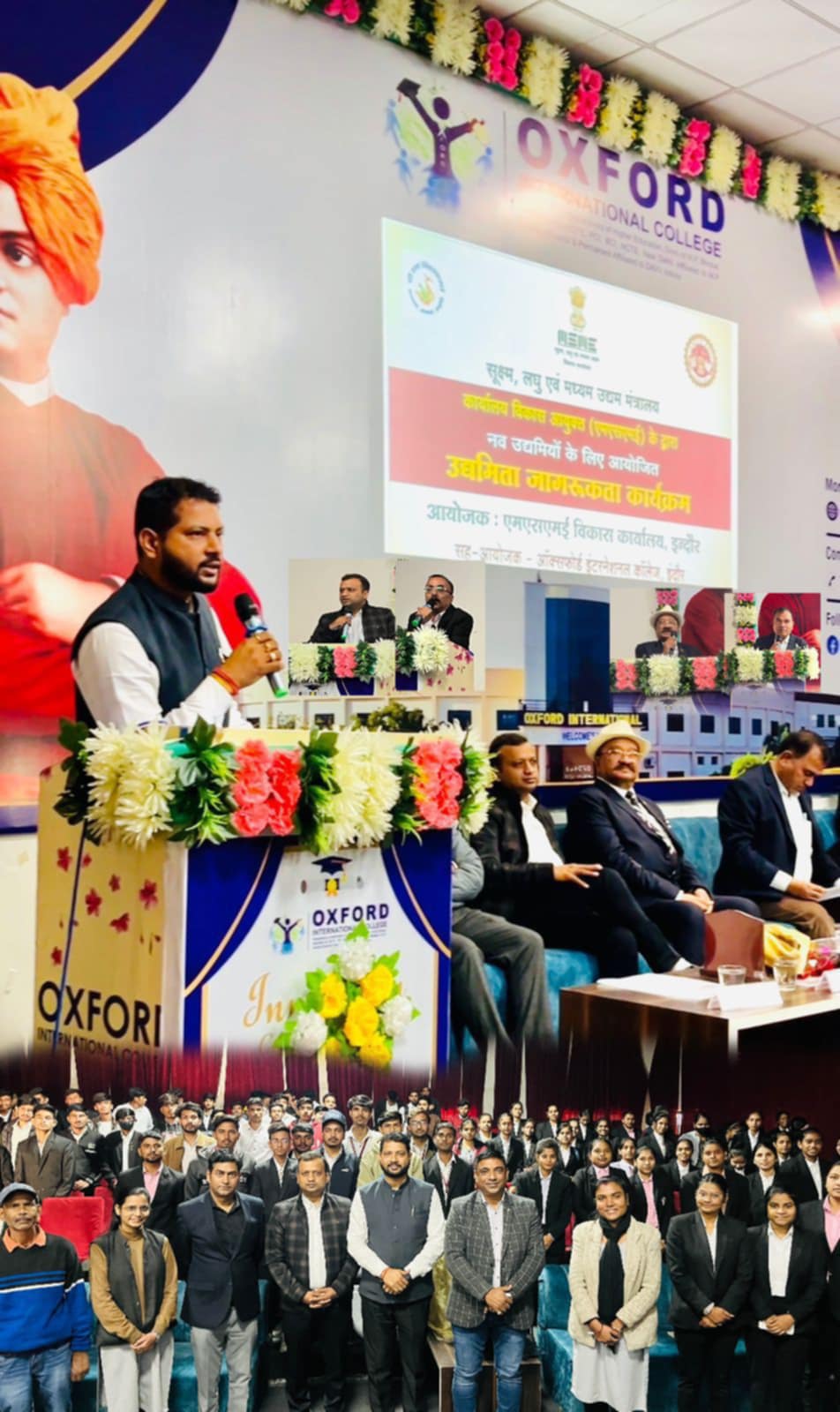 इंदौर : ऑक्सफ़ोर्ड इंटरनैशनल कॉलेज इंदौर में एम.एस.एम.ई (डी.एफ.ओ) इंदौर द्वारा एक दिवसीय “उद्यमिता जागरूकता कार्यक्रम” आयोजित किया गया। जिसमें संस्थान के विद्यार्थियों एवं शिक्षकों को उद्यमिता विकास के गुर सिखाए गये। एम.एस.एम.ई- डी.एफ ओ इंदौर द्वारा आयोजित उक्त कार्यक्रम में १२० से अघिक विद्यार्थियों की सहभागिता रही। यहां जारी एक प्रेस विज्ञप्ति में संस्था के समूह निदेशक डॉ. पुनीत कुमार द्विवेदी ने बताया कि ऑक्सफोर्ड इंटरनैशनल कॉलेज एवं एम.एस.एम.ई (डी.एफ.ओ) इंदौर के संयुक्त तत्वावधान में यह कार्यक्रम आयोजित किया गया था। कार्यक्रम में अतिथि के रूप में दिलीप देव (संस्थापक- एड.डी वायर इंदौर), एस.एस. मंडलोई (महाप्रबंधक- डी.टी.आई.सी इंदौर), सुनील ढाका लीड बैंक मैनेजर (बैंक ऑफ इंडिया), गौरव गोयल (सहायक निदेशक- एम.एस.एम.ई-डी.एफ.ओ इंदौर), आदित्य एस.जी व्यास (सी.ई.ओ- दृष्टि सीपीएस फ़ाऊंडेशन, आई.आई.टी इंदौर), पंकज व्यास ( निदेशक बीजा ट्रेनिंग इंदौर), रजनीश शर्मा (संस्थापक- ग्लोबल ट्रेड हाऊस, इंदौर)!
