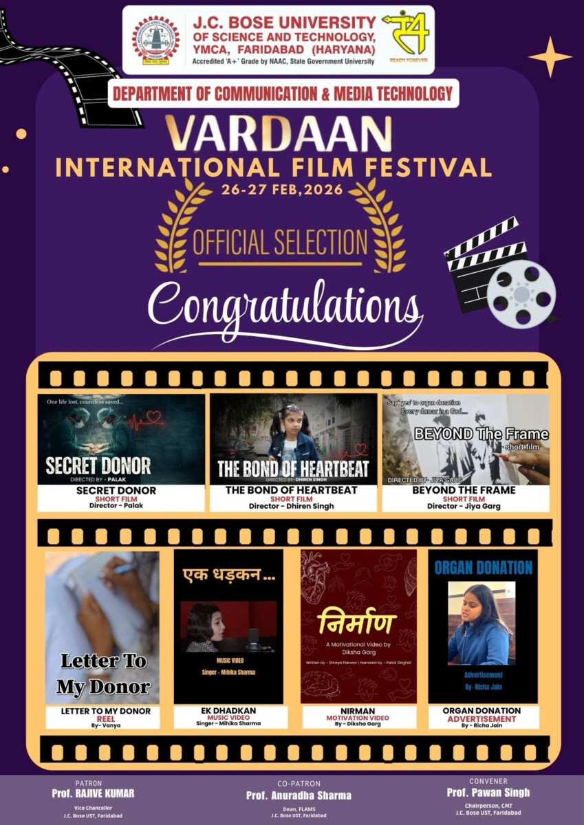 फरीदाबाद, 16 फरवरी (मनीष शर्मा)। जे.सी.बोस विश्वविद्यालय वाईएमसीए के संचार एवं प्रौद्योगिकी विभाग के विद्यार्थियों ने एक बार फिर अपनी रचनात्मकता और प्रतिभा का उत्कृष्ट प्रदर्शन करते हुए वरदान इंटरनेशनल फिल्म फेस्टिवल 2026 में उल्लेखनीय सफलता प्राप्त की है। यह फिल्म फेस्टिवल 26 और 27 फरवरी 2026 को आयोजित किया जा रहा है, जिसमें विभाग की कई लघु फिल्में और वीडियो आधिकारिक चयन में शामिल की गई हैं। जिसके लिए कुलगुरु, कुलसचिव, डीन, विभागाध्यक्ष और फैकल्टी ने मीडिया विद्यार्थियों को बधाई एवं शुभकामनाएं दी हैं।