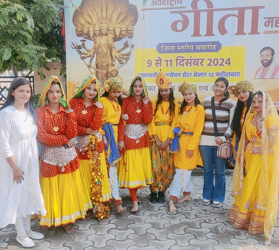 फरीदाबाद : हुड्डा कन्वेंशन सेंटर सेक्टर 12 फरीदाबाद में जिला प्रशासन द्वारा आयोजित किए जा रहे अंतरराष्ट्रीय गीता महोत्सव में शिक्षा विभाग के आदेशानुसार राजकीय आदर्श वरिष्ठ माध्यमिक विद्यालय सराय ख्वाजा फरीदाबाद की जूनियर रेडक्रॉस, गाइड्स और सैंट जॉन एंबुलेंस ब्रिगेड सदस्य छात्राओं ने प्राचार्य रविंद्र कुमार मनचंदा के निर्देशानुसार मनमोहक सांस्कृतिक कार्यक्रम प्रस्तुत किया। विद्यालय की जूनियर रेडक्रॉस और सैंट जॉन एंबुलेंस ब्रिगेड प्रभारी प्राचार्य रविंद्र कुमार मनचंदा ने कहा कि विद्यालय की छात्राओं नेहा, चांदनी, वंदना, राखी, वंदना, भूमि, करिश्मा, नीतू और विनीता के समूह ने हुड्डा सभागार में प्राध्यापिका मिकी और नम्रता के नेतृत्व में सभागार के मंच पर सांस्कृतिक कार्यक्रम के अंतर्गत मनमोहक सामूहिक नृत्य प्रस्तुत कर सभी को मंत्रमुग्ध कर दिया। विद्यालय की छात्राओं ने श्रीमद्भागवतगीता के महत्व को गीत और नृत्य के माध्यम से दर्शाया। नृत्य में छात्राओं ने कर्म की प्रधानता और निस्वार्थ कर्म करते रहने को ही जीवन का सार बताया। प्राचार्य रविंद्र कुमार मनचंदा ने कहा कि श्रीमद्भागवतगीता के अध्ययन से हमारे आदर्श जीवन जीने का मार्ग प्रशस्त होता है। हमें हमारी सभी समस्याओं और प्रश्नों का समाधान श्रीमद्भागवतगीता में सुलभता से मिल जाता है।