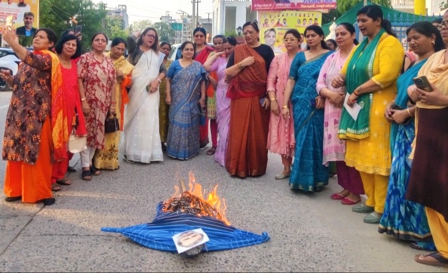 फरीदाबाद : नारी शक्ति वंदन अधिनियम (महिला आरक्षण बिल) को गिराए जाने के विरोध में पार्टी की महिला नेताओं, कार्यकर्ताओं व सामाजिक महिलाओं ने जिला संयोजक अनिता शर्मा के संयोजन में जन आक्रोश महिला सम्मेलन का आयोजन किया गया और फरीदाबाद के सेक्टर-15 स्थित जिला कार्यालय के बाहर महिलाओं ने कांग्रेस और विपक्षी दलों के खिलाफ जोरदार प्रदर्शन किया। महिलाओं द्वारा राहुल गांधी का पुतला दहन किया गया और “कांग्रेस मुर्दाबाद” तथा “राहुल गांधी मुर्दाबाद” के नारे लगाये । इस दौरान बड़ी संख्या में महिला कार्यकर्ताओं ने सड़कों पर उतरकर अपना आक्रोश व्यक्त किया।