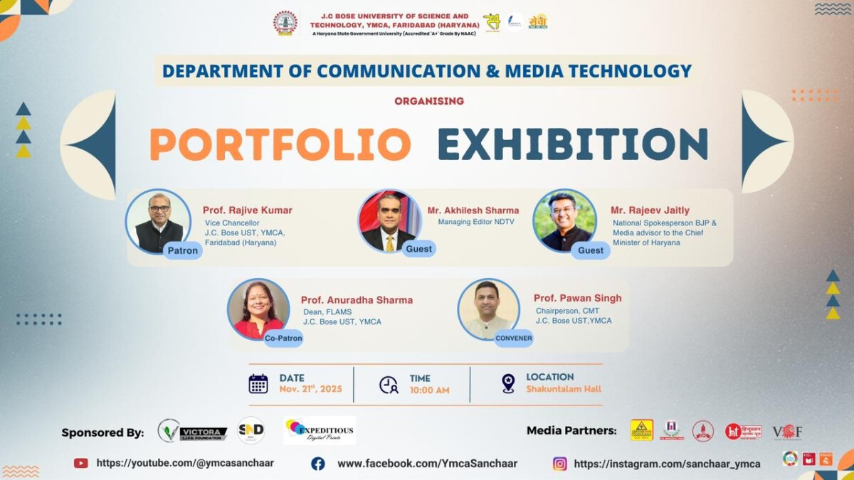 फरीदाबाद, 20 नवंबर : जे.सी. बोस विज्ञान एवं प्रौद्योगिकी विश्वविद्यालय, वाईएमसीए, फरीदाबाद के संचार एवं मीडिया प्रौद्योगिकी विभाग द्वारा 21 नवंबर (शुक्रवार) को शाकुंतलम सभागार में “पोर्टफोलियो प्रदर्शनी-2025” का भव्य आयोजन किया जा रहा है। इस प्रदर्शनी में विभाग के मीडिया, सोशल वर्क और विजुअल कम्युनिकेशन के अंतिम वर्ष (स्नातक और स्नातकोत्तर) के विद्यार्थियों द्वारा फोटोग्राफी, वीडियो प्रोडक्शन, ग्राफिक डिजाइन, डिजिटल मीडिया, प्रिंट पत्रकारिता, विज्ञापन व अन्य रचनात्मक क्षेत्रों में तैयार किए गए उत्कृष्ट प्रोजेक्ट्स और पोर्टफोलियो का प्रदर्शन होगा। यह आयोजन छात्रों की कला, तकनीकी कौशल और रचनात्मकता को मीडिया जगत व उद्योग विशेषज्ञों के सामने प्रस्तुत करने का महत्वपूर्ण मंच होगा। जो छात्रों के प्रशिक्षण और प्लेसमेंट पर केंद्रित है। आयोजन में विशिष्ट अतिथि के रूप में एनडीटीवी के प्रबंध निदेशक अखिलेश शर्मा और भारतीय जनता पार्टी के राष्ट्रीय प्रवक्ता एवं हरियाणा मुख्यमंत्री के मीडिया सलाहकार राजीव जेटली उपस्थित रहेंगे। कार्यक्रम की अध्यक्षता विश्वविद्यालय कुलगुरु प्रो. राजीव कुमार करेंगे। सह-संरक्षक के रूप में प्रो. अनुराधा शर्मा, डीन व संयोजक के रूप में प्रो. पवन सिंह, अध्यक्ष, संचार एवं मीडिया प्रौद्योगिकी विभाग उपस्थित रहेंगे।