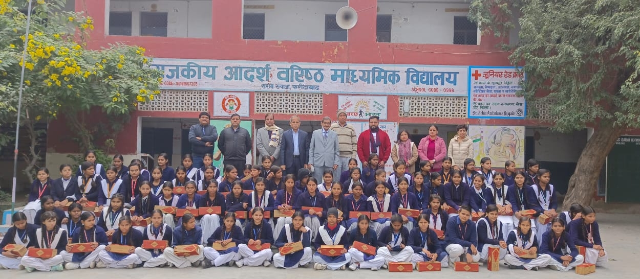फरीदाबाद : राजकीय आदर्श वरिष्ठ माध्यमिक विद्यालय सराय ख्वाजा फरीदाबाद में प्राचार्य रविंद्र कुमार मनचंदा की अध्यक्षता में जन कल्याण संस्था ने विद्यालय की जूनियर रेडक्रास और सैंट जॉन एम्बुलेंस ब्रिगेड के सहयोग से विद्यालय की छात्राओं और छात्रों को स्वेटर तथा शूज बांटे। विद्यालय की जूनियर रेडक्रॉस और सैंट जॉन एंबुलेंस ब्रिगेड अधिकारी प्राचार्य रवीन्द्र कुमार मनचन्दा ने बताया कि सर्दी से बचाव के लिए जन कल्याण संस्था के फाउंडर प्रेसिडेंट एस सी गुप्ता, वरिष्ठ सदस्य जे पी शर्मा व महासचिव जन कल्याण संस्था के महासचिव लक्ष्मण शर्मा ने सभी एक सौ पच्चीस विद्यार्थियों को स्वेटर और शूज वितरित किए।