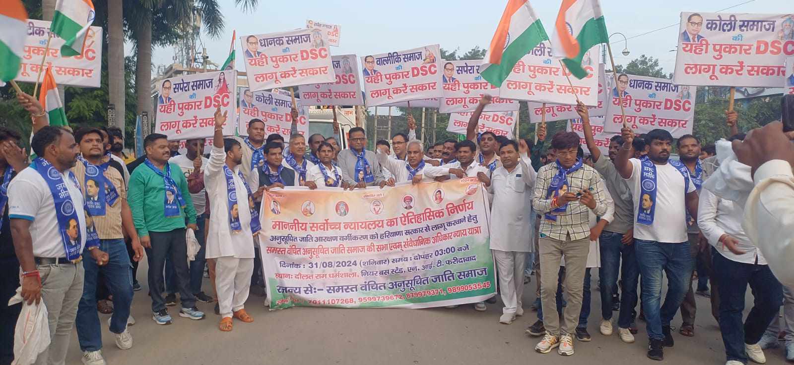 फरीदाबाद : समस्त वंचित अनुसूचित जाति समाज की सभा एवम् संवैधानिक अधिकार न्याय यात्रा का आयोजन दौलत राम धर्मशाला एन आई टी फरीदाबाद में किया गया जिसमें पलवल, मेवात व फरीदाबाद के हजारो वंचित समाज के लोगों ने भाग लेकर माननीय सर्वोच्च न्यायलय के ऐतिहासिक निर्णय का स्वागत किया और जल्दी से जल्दी समस्त वंचित अनुसूचित जाति आरक्षण वर्गीकरण को लागू करवाने के लिए केन्द्र सरकार पुरजोर मांग की। कार्यक्रम की अध्यक्षता सेवानिवृत न्यायधीश पवन कुमार ने की। कार्यक्रम में सेवानिवृत तहसीलदार प्रताप सिंह, पूर्व डीसीपी पूरन चन्द पंवार, एडीए हरकेश, रमेश लुहेरा, रमेश शारिया, जय सिंह राणा, शान बाबूजी, राजेन्द्र प्रधान वाल्मीकि मंदिर कमेटी, जसविन्द्र पहलवान बली सेना, विनय प्रकाश, जितेन्द्र आर्य, संजय मेहरोलिया, सौरव वाल्मीकि अध्यक्ष आधस वाल्मीकि मन्दिर प्रबंधक सेवा ट्रस्ट, किरणपाल हरियाणा वाल्मीकि महासभा प्रदेश उपाध्यक्ष, सचिन सरपंच भनकपुर, कर्मवीर, प्रवीन मोरिया व सुभाष गहलोत ने एक सुर में कहा कि हम संविधान के दायरे में रहकर अपना हक लेगें।