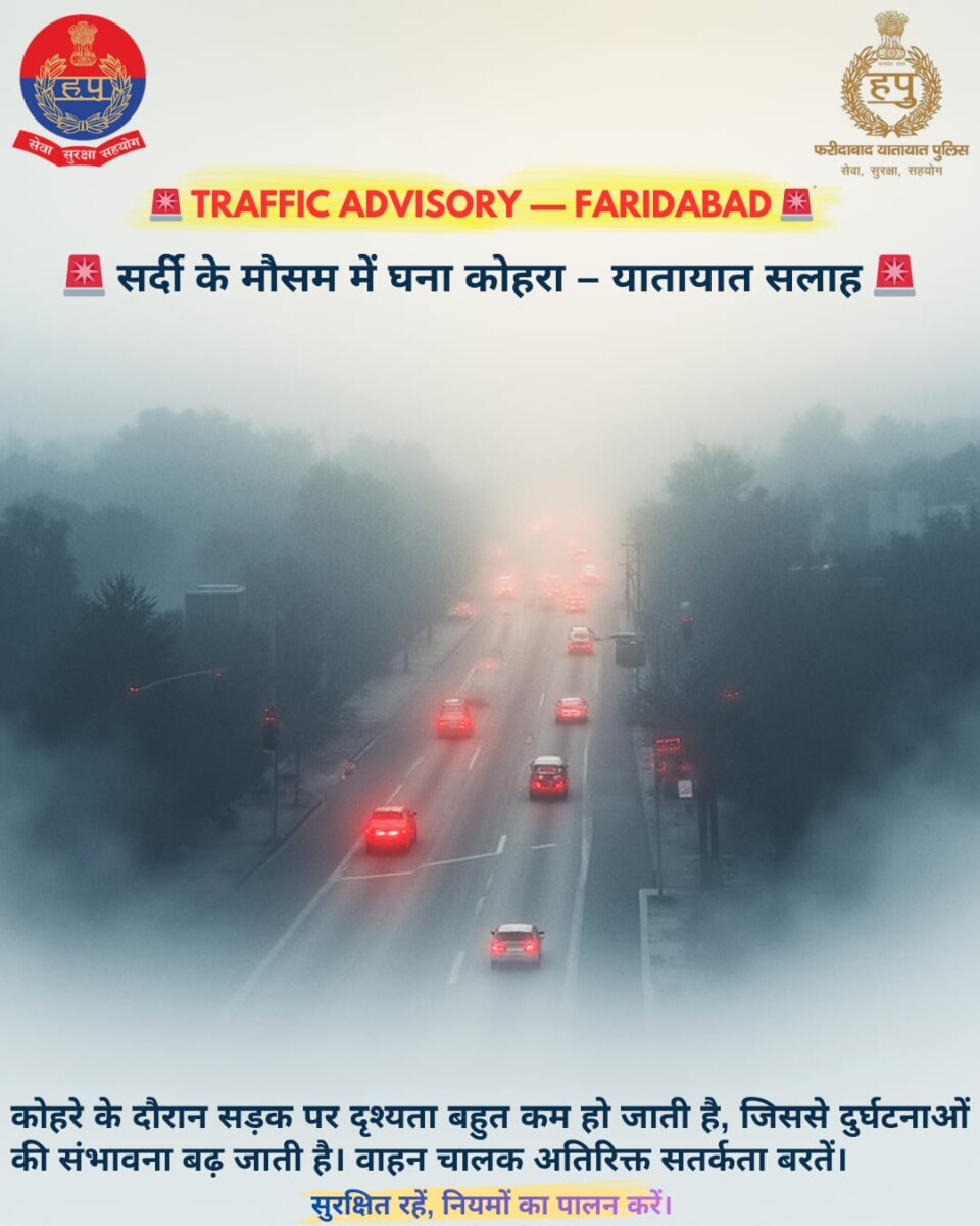 फरीदाबाद पुलिस की आमजन से अपील है कि कोहरे के समय उपरोक्त एडवाइजरी को ध्यान रखते हुये सुरक्षित यात्रा करें। फरीदाबाद पुलिस सदैव सेवा, सुरक्षा एवं सहयोग के लिए तत्पर है।