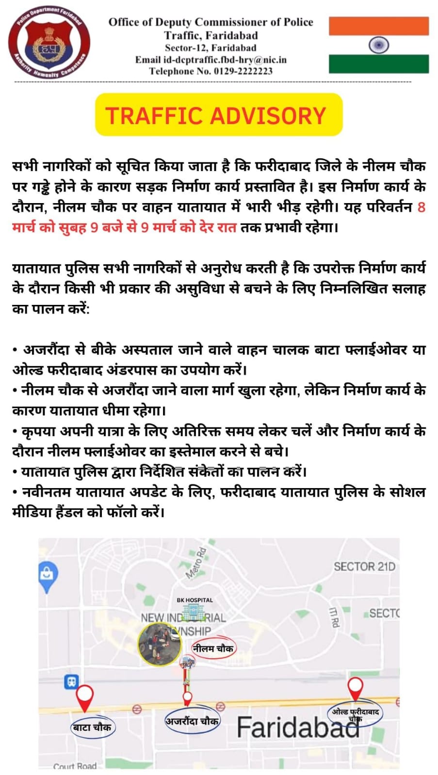 फरीदाबाद : यातायात पुलिस सभी नागरिकों को सूचित करती है कि फरीदाबाद जिले के नीलम चौक पर गड्ढे होने के कारण सड़क निर्माण कार्य प्रस्तावित है। इस निर्माण कार्य के दौरान, नीलम चौक पर वाहन यातायात में भारी भीड़ रहेगी। यह परिवर्तन 8 मार्च को सुबह 9 बजे से 9 मार्च को देर रात तक प्रभावी रहेगा।