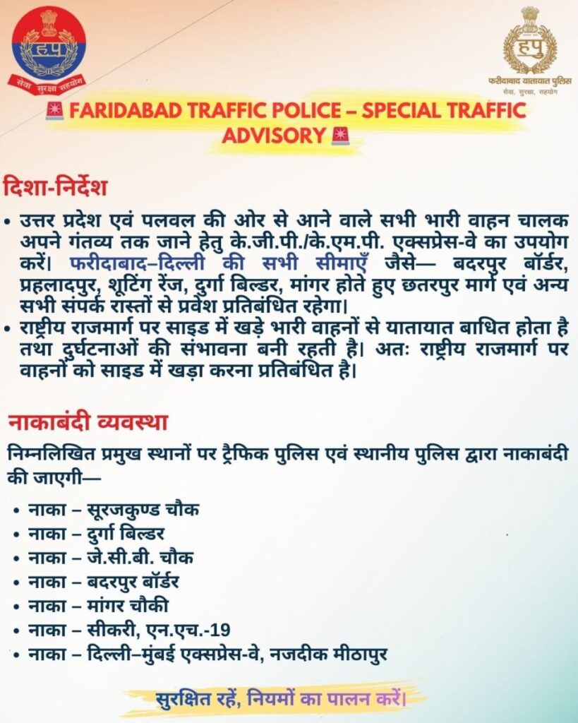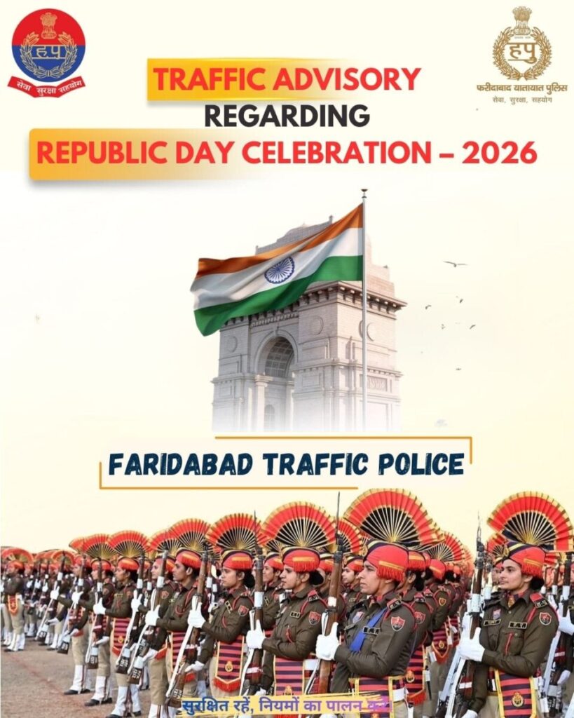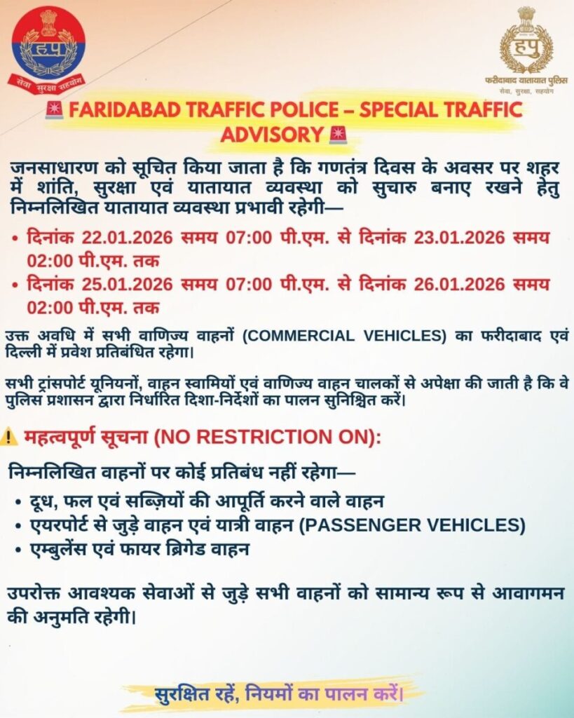 बैठक के उपरांत फरीदाबाद ट्रैफिक पुलिस द्वारा गणतंत्र दिवस के अवसर पर ट्रैफिक एडवाइजरी जारी की गई। इसके अंतर्गत जनसाधारण को सूचित किया गया है कि दिनांक 22.01.2026 समय 07:00 पी.एम. से 23.01.2026 समय 02:00 पी.एम. तक तथा दिनांक 25.01.2026 को समय 07:00 पी.एम. से 26.01.2026 समय 02:00 पी.एम. तक सभी वाणिज्य वाहनों का फरीदाबाद एवं दिल्ली में प्रवेश प्रतिबंधित रहेगा। हालांकि दूध, फल-सब्ज़ी की आपूर्ति करने वाले वाहन, एयरपोर्ट से जुड़े यात्री वाहन, एम्बुलेंस एवं फायर ब्रिगेड जैसी आवश्यक सेवाओं से जुड़े वाहनों पर कोई प्रतिबंध नहीं रहेगा। उत्तर प्रदेश एवं पलवल की ओर से आने वाले भारी वाहन चालकों को के.जी.पी.–के.एम.पी. एक्सप्रेस-वे का उपयोग करने की सलाह दी गई है।