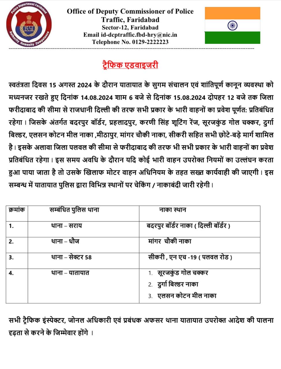 स्वतंत्रता दिवस पर यातायात प्रबंध व सुरक्षा के मद्देनजर 14 अगस्त को सांय 6 बजे से दिनांक 15 अगस्त दोपहर 12 तक जिला फरीदाबाद की सीमा से राजधानी दिल्ली की तरफ सभी प्रकार के भारी वाहनों का प्रवेश रहेगा पूर्णत: प्रतिबंधित